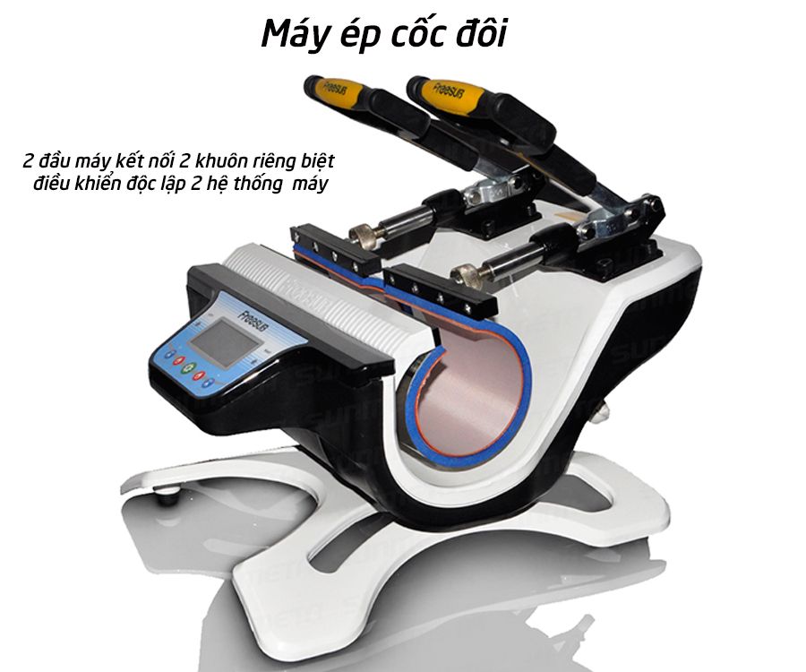 Máy in cốc đôi ngoài việc sử dụng in 2 chiếc cốc một lúc cũng có thể sử dụng như 1 máy in cốc đơn với 2 hệ thống điện hoạt động độc lập. Rất phù hợp với các shop in cốc có nhu cầu giảm thời gian sản xuất. Điện áp 220 V và công xuất 280 W. Thời gian in là 60 giây và nhiệt độ là 185 độ C.