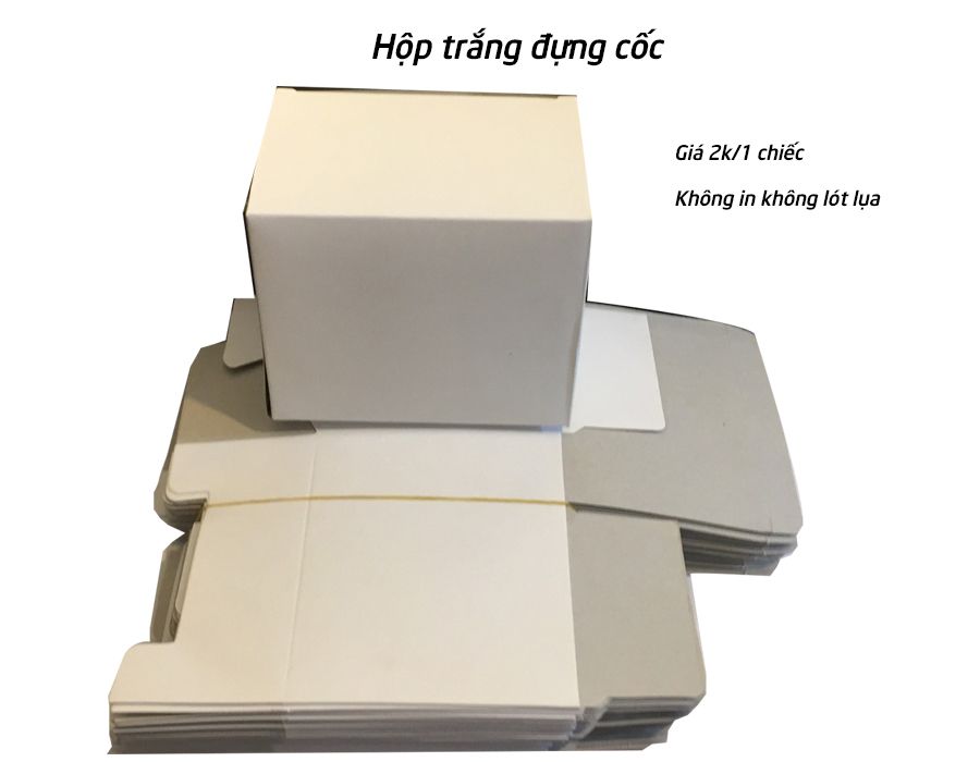 Công ty chúng tôi chuyên cung cấp cho các xưởng in cốc gồm 3 loại hộp cốc là hộp cốc thường và hộp cốc cao cấp và hộp đựng cốc có xốp. Hộp cốc thường hay còn gọi là hộp trắng đựng cốc được làm từ bìa các ton màu trắng, dạng hộp gấp, loại hộp này được sử dụng phổ biến cho các xưởng in cốc. Hộp cốc này giá thành thấp, cắt và dán sẵn, chỉ gắp thành hộp khi cần sử dụng nên không tốn diện tích chứa hàng nhiều, thuận tiện khi vận chuyển.